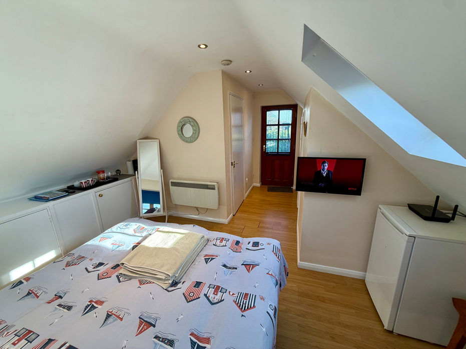 Inside, the loft feels calm, airy and welcoming, offering a peaceful space to return to after a day by the sea or exploring the surrounding countryside. The bright open plan living area is filled with natural light and provides comfortable seating alongside a Smart TV with Netflix for cosy evenings in. The kitchenette is equipped with a fridge, microwave and kettle, making it easy to prepare simple meals or enjoy a relaxed breakfast before heading out for the day.